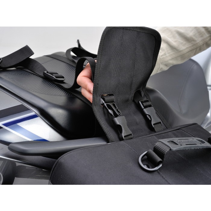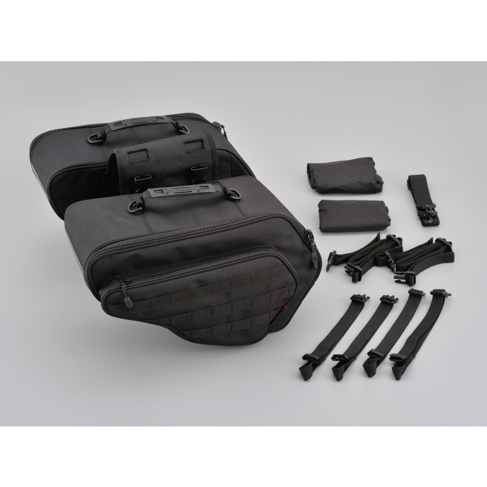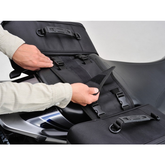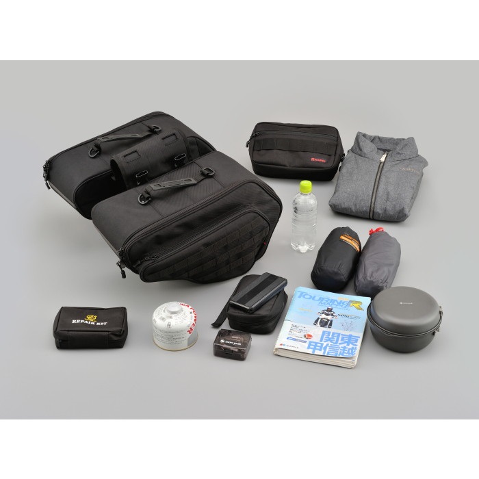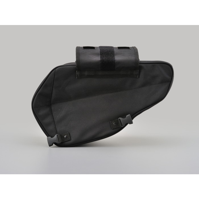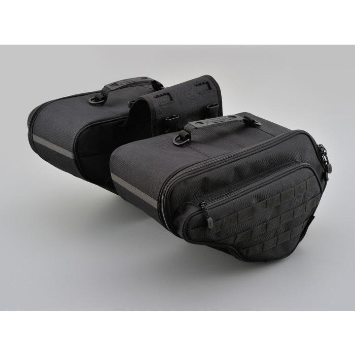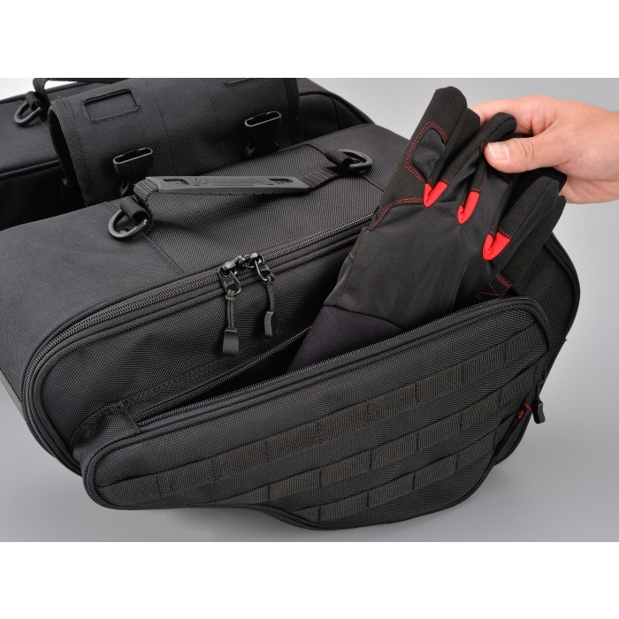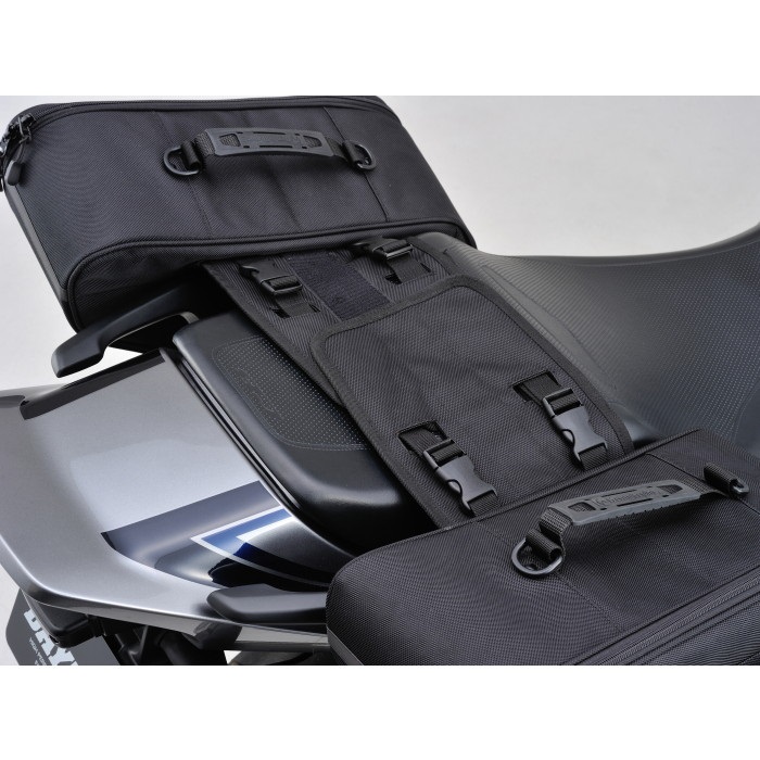 小分けに便利、アウターポケット付き。背面の凹みがはり出しを防止、車体にフィットします。シートに荷物があっても出し入れ可能なサイドオープンタイプ。ウインカーに接触しにくいスラントデザイン、タンデムも可能です。