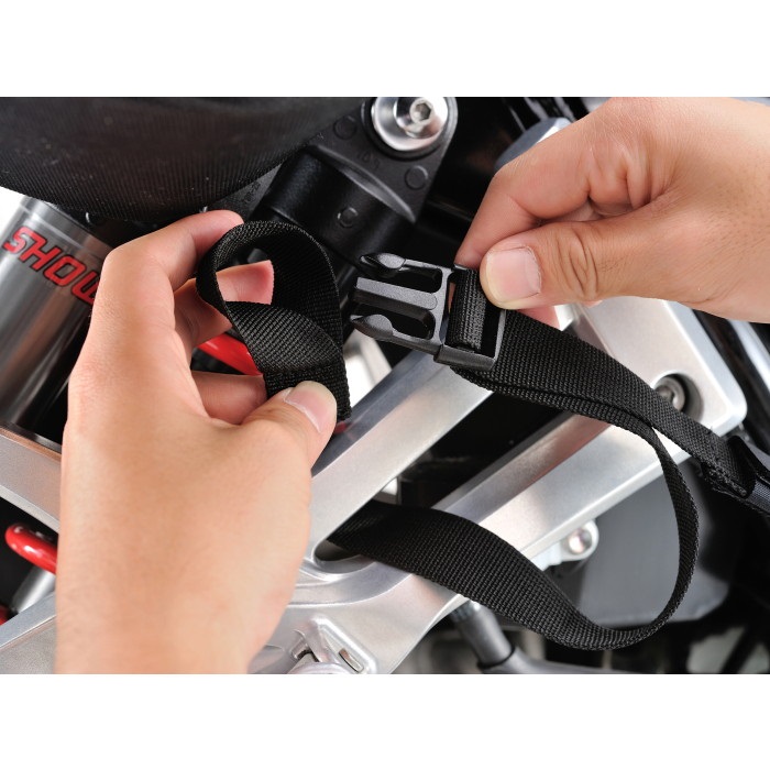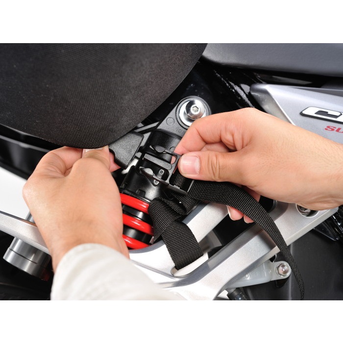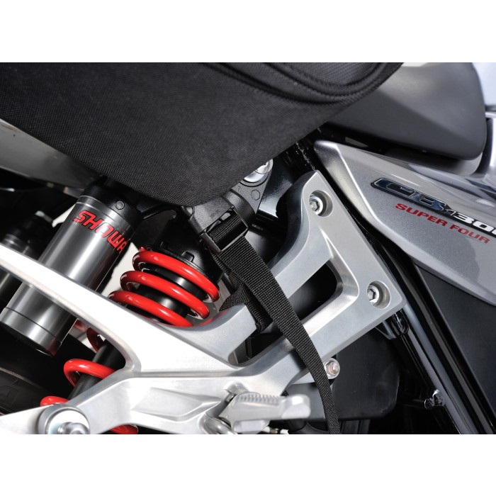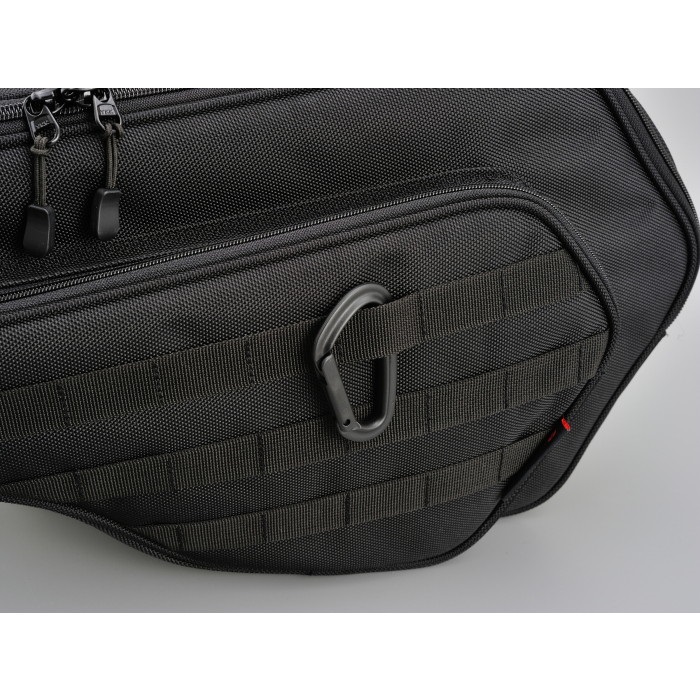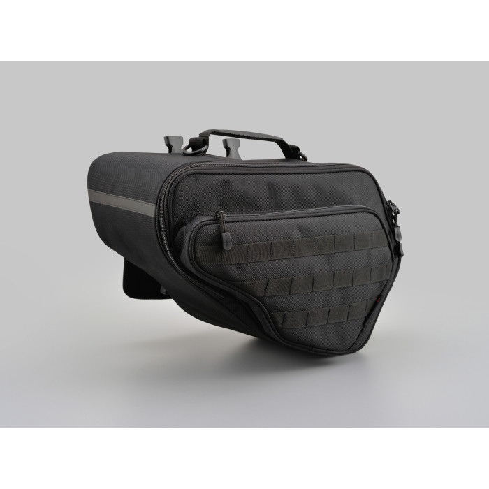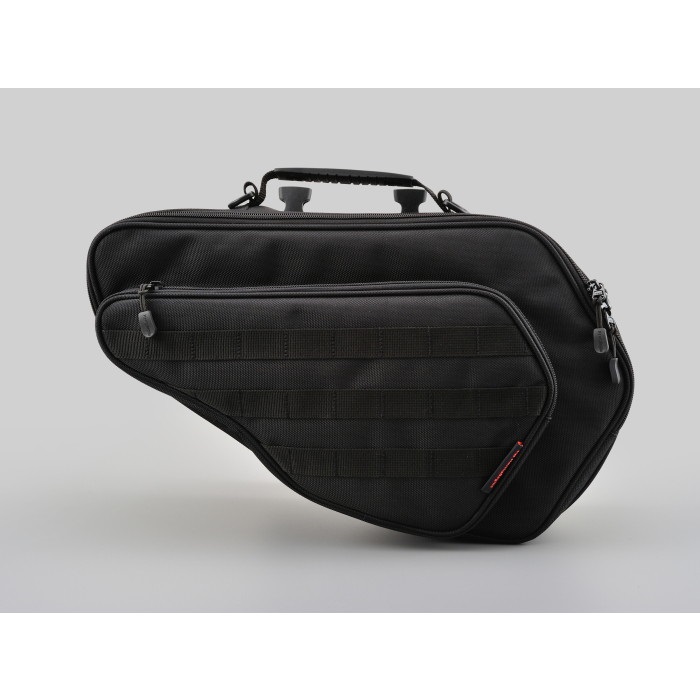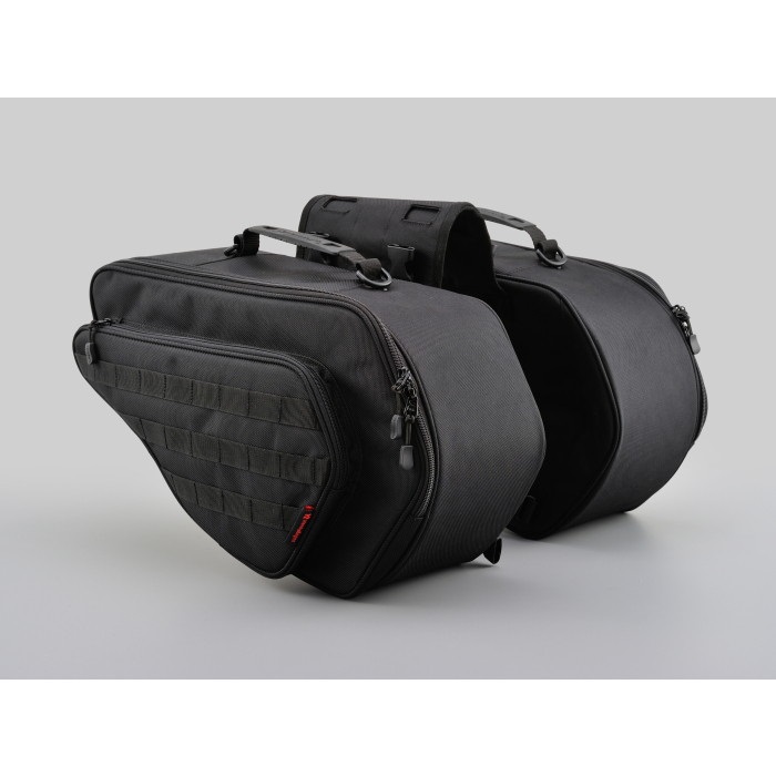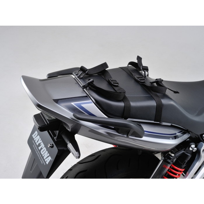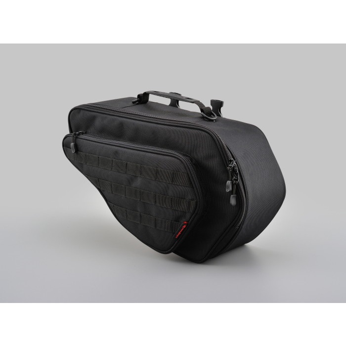 小分けに便利、アウターポケット付き。背面の凹みがはり出しを防止、車体にフィットします。シートに荷物があっても出し入れ可能なサイドオープンタイプ。ウインカーに接触しにくいスラントデザイン、タンデムも可能です。