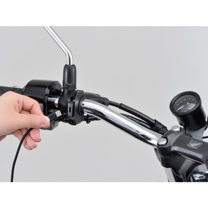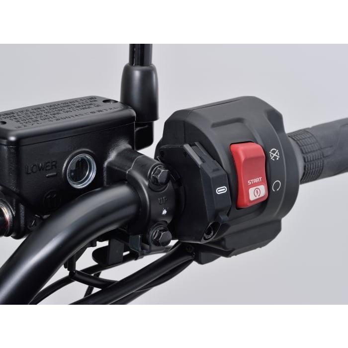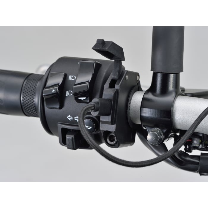 ブレーキスイッチとフレームのボルトに共締めするだけの簡単取り付け。本体幅11mm(取り付け幅12mm)のスマート設計で、コントロールスイッチに馴染むデザインです。