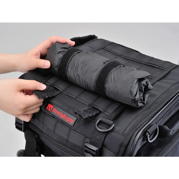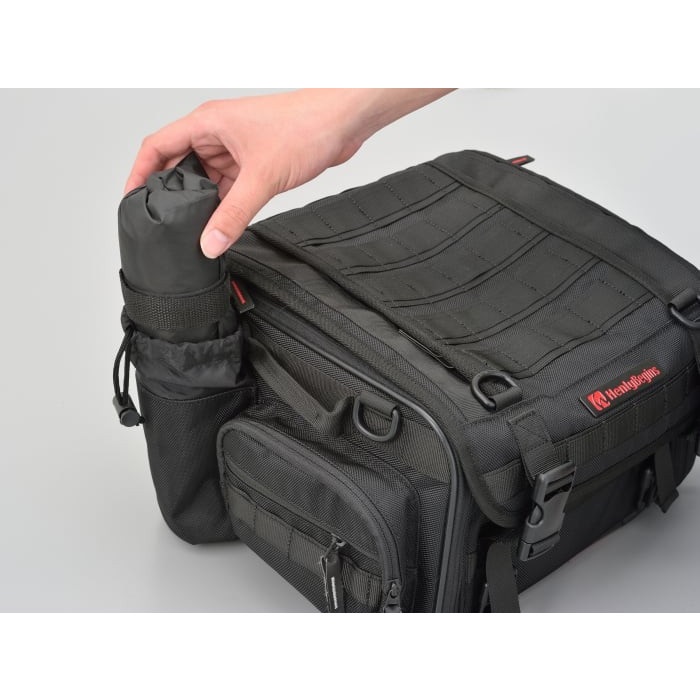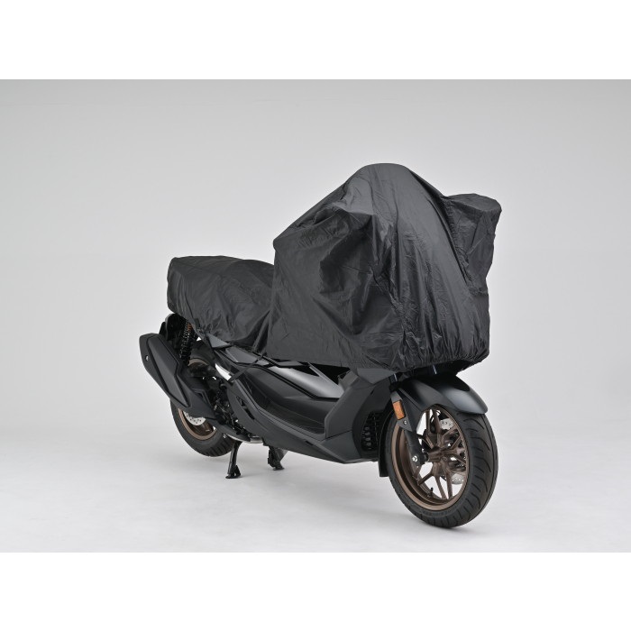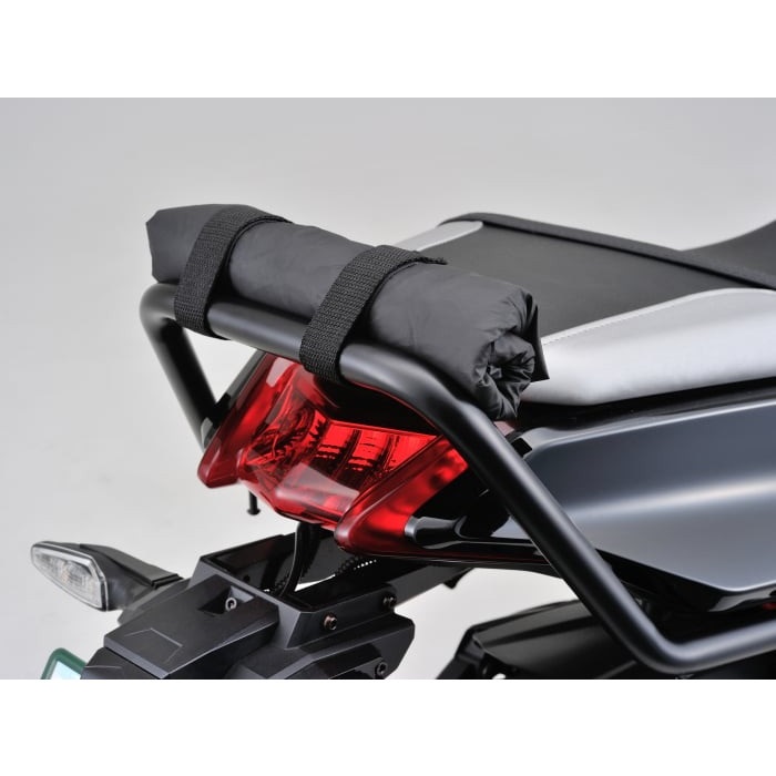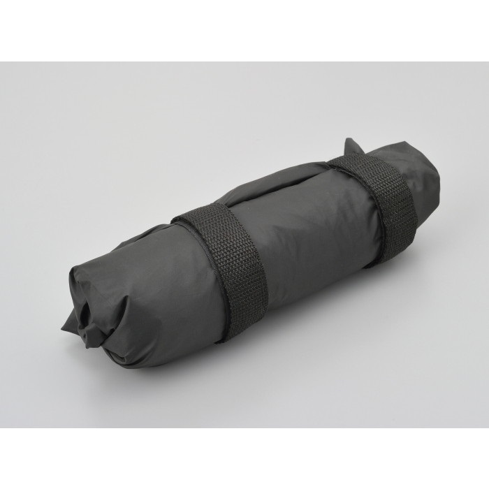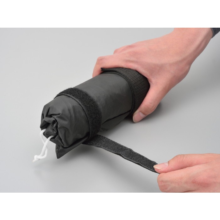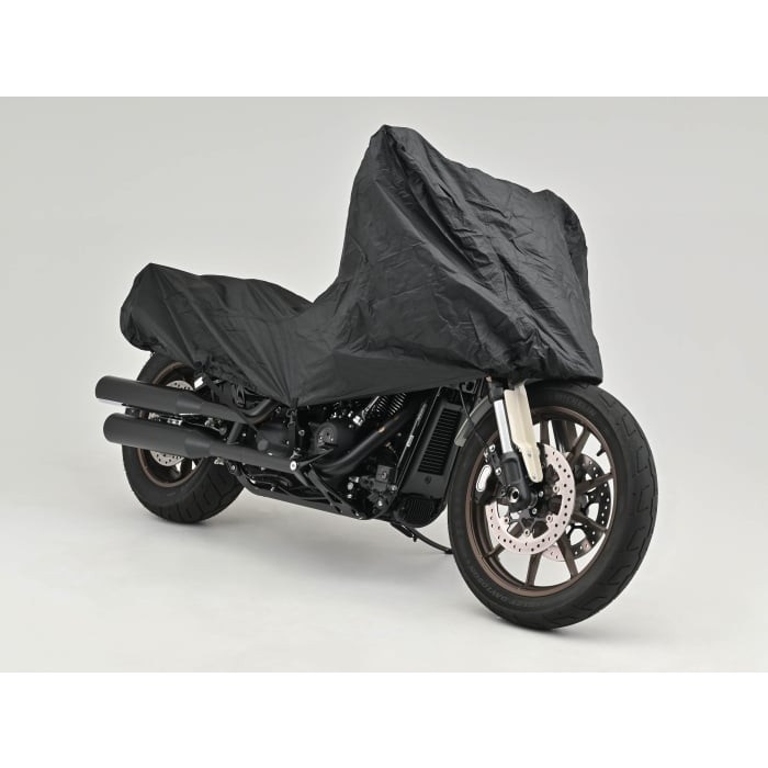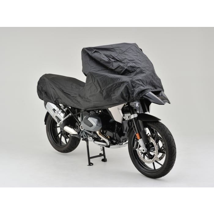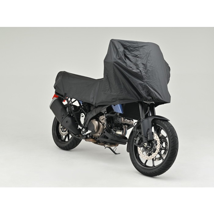 はっ水生地が夜露によるシートやタンクの水濡れを防ぐバイク用ハーフカバー。車体の上半分が隠れるので、駐車時のイタズラ防止効果もあります。後ろ裾のドローコードと左右のゴムベルトで簡単に固定でき、マフラーの熱に影響されにくいので、駐車時に直ぐ掛けることができます。使わない時はクルッと丸めてコンパクトに収納できるので携帯に便利。ツーリングバッグの中でも場所を取りません。