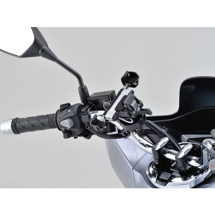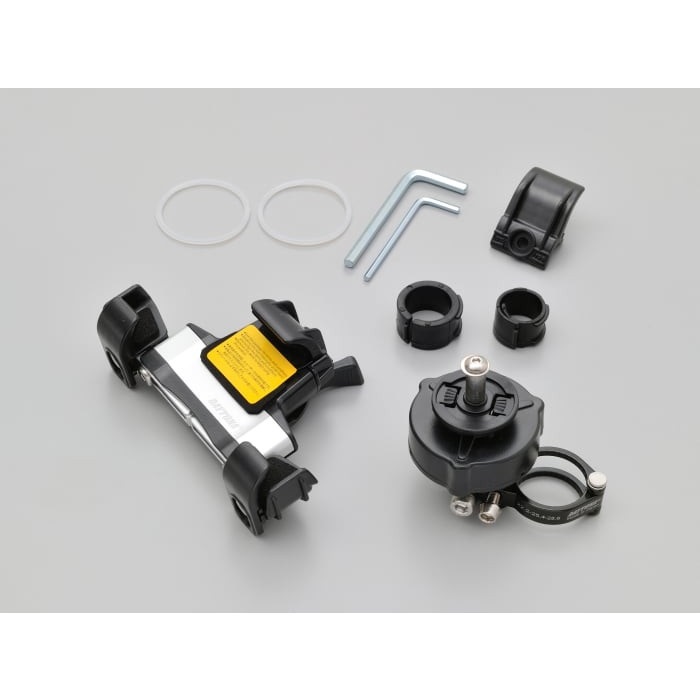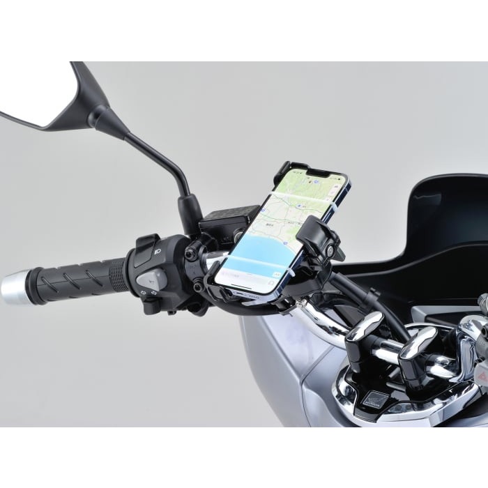 操作性の良い大き目のロックレバーを採用しています。スマートフォンを装着した状態で工具を使用せず360°回転が可能。また、左右に首振りができるのでバーハンドルの水平ではない斜めに立ち上がる部分にも装着できます。