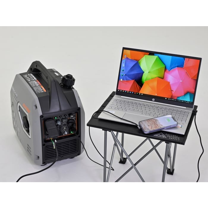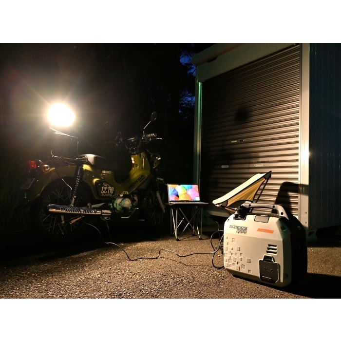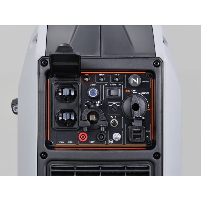 軽量でコンパクトなのに1700Wの高出力。発電機の内部のレイアウトの見直しによりコンパクト化が実現。また、インバーター発電機なのでパソコンやスマートフォンなどの精密機器でも安心してご使用いただけます。標準装備でAC100V (20A) 2ポート、シガーソケット (8.3A) 1ポート、USB (2.1A/1A) 2ポート付き、さらに付属のUSBシガーソケットを使うことでUSB (2.4A/2.4A) を2ポート追加することができます。