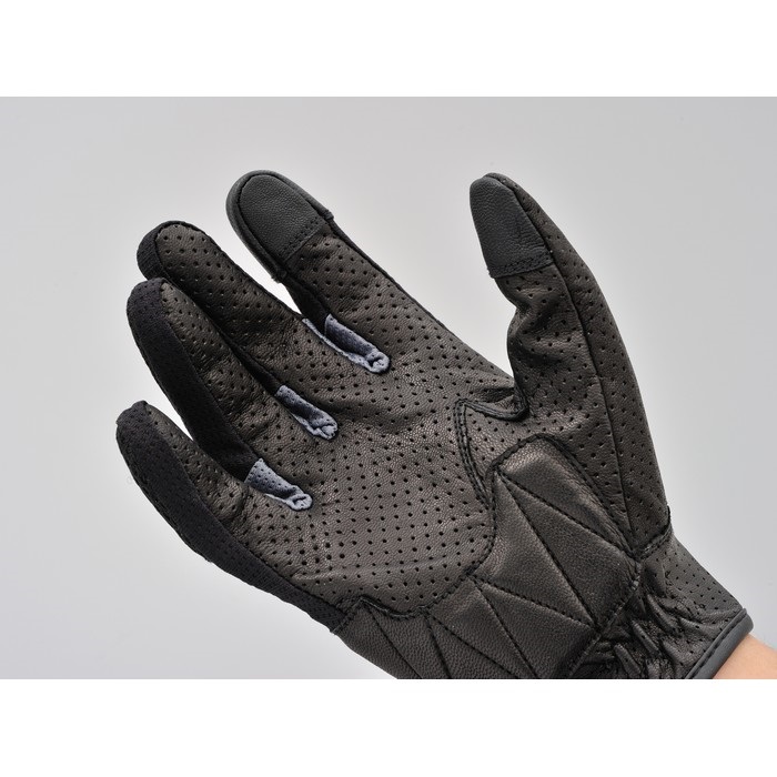 手の甲側は通気性とストレッチ性に優れたメッシュ素材、手の平側は全面パンチング加工を施した本革を採用。