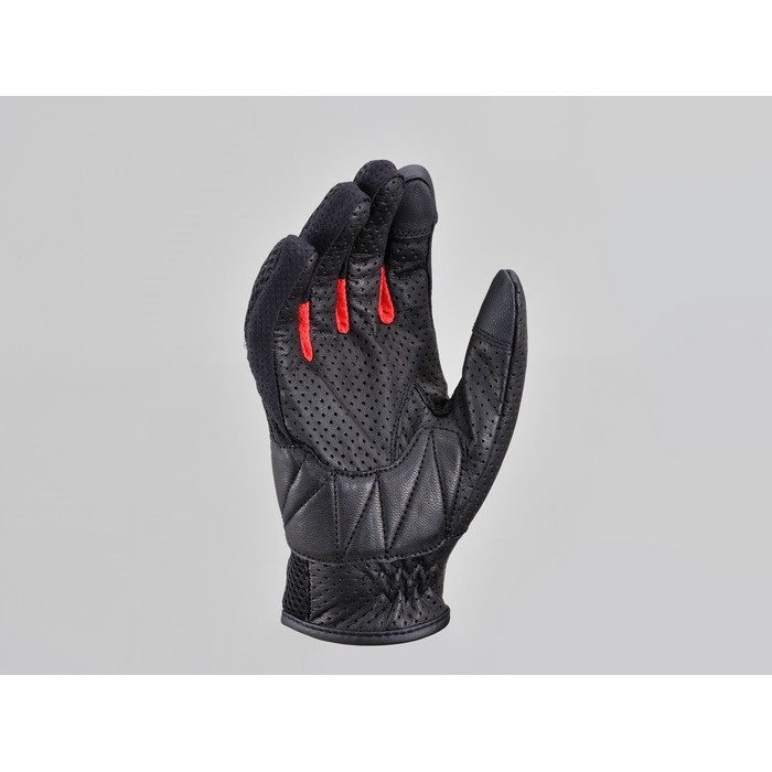 手の甲側は通気性とストレッチ性に優れたメッシュ素材、手の平側は全面パンチング加工を施した本革を採用。