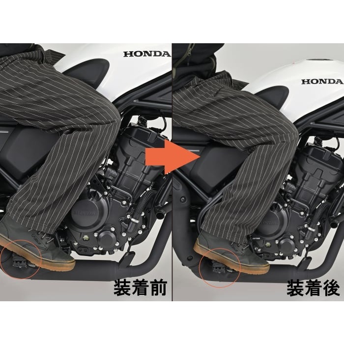 停車時に足にぶつかりやすいノーマルステップを前方へオフセットすることでスムーズな足着きを実現。ひざの曲がりも緩くなるのでライディングが快適になります。