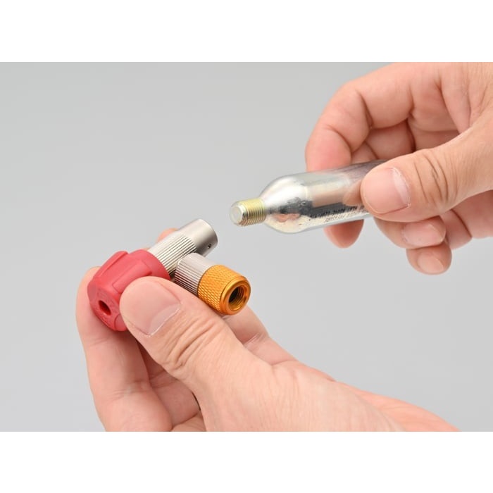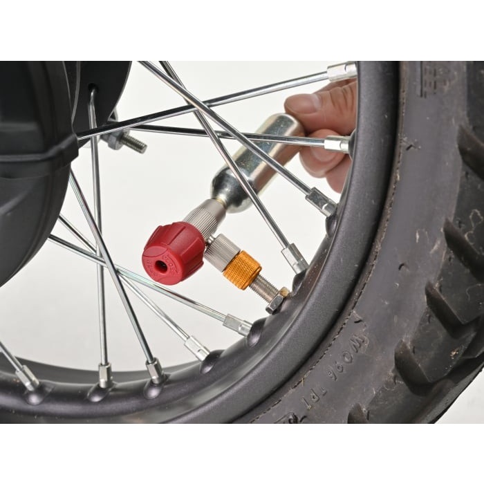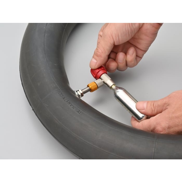 ・目安としてエアボンベ1本で80/90-17インチチューブタイヤに約160kPa(1.60kgf/cm2)の補充が可能。