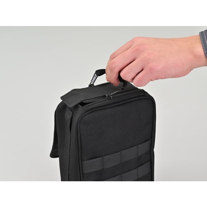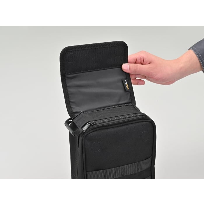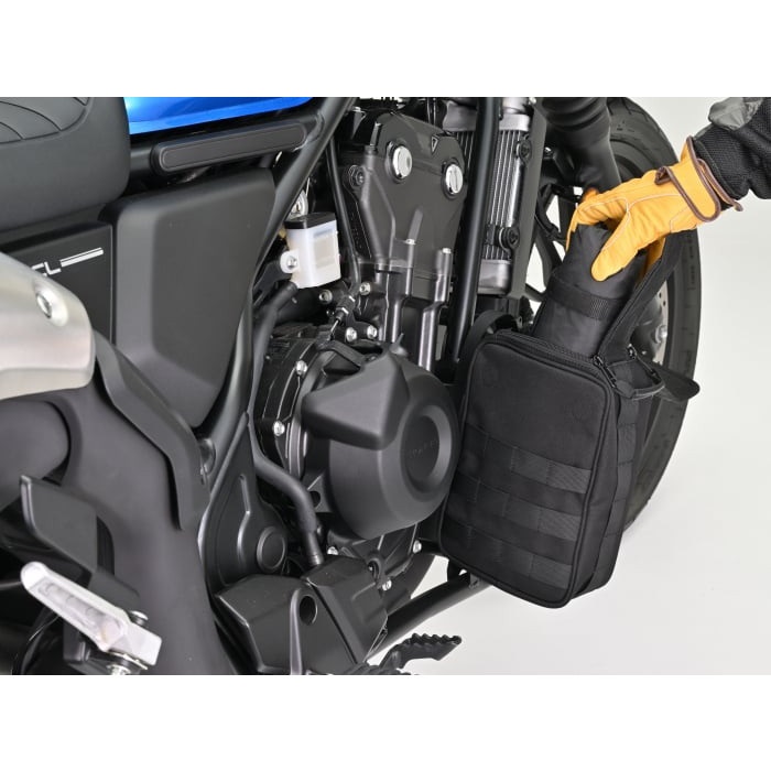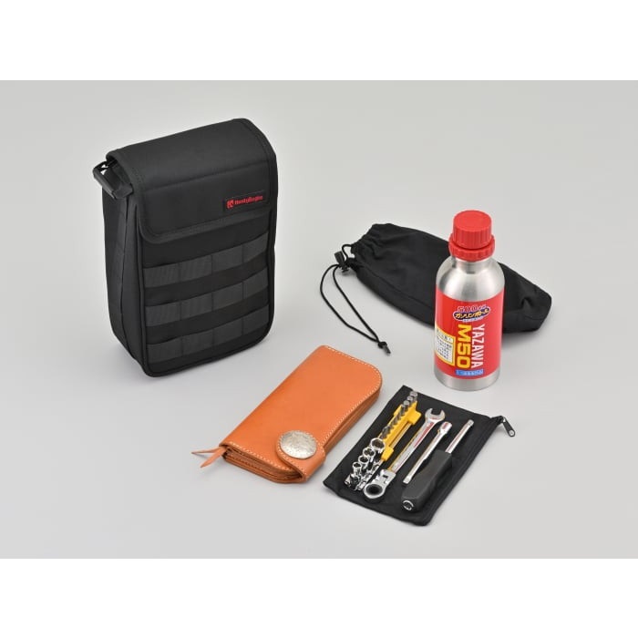 生地にはタフな「600D CORDURA」を採用しました。エンジンガードやグラブバー付近の装着にベストな縦長サイズ。車載工具やガソリン携行ボトル、パンク修理キット等の収納に最適。