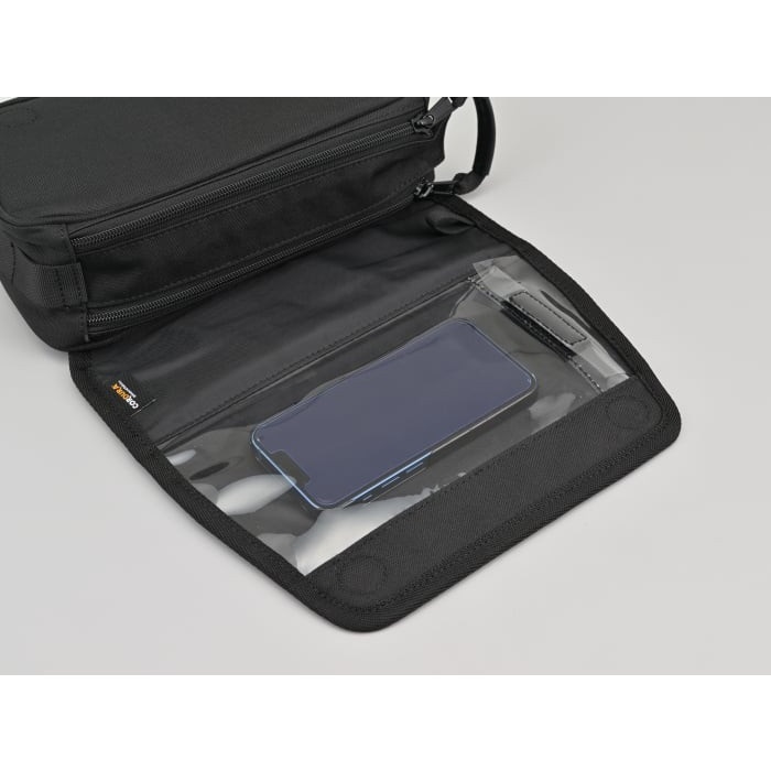 小ぶりながら600mLペットボトルもスッポリ収まります。フラップ裏にはスマホを入れられるクリアーポケットつき。