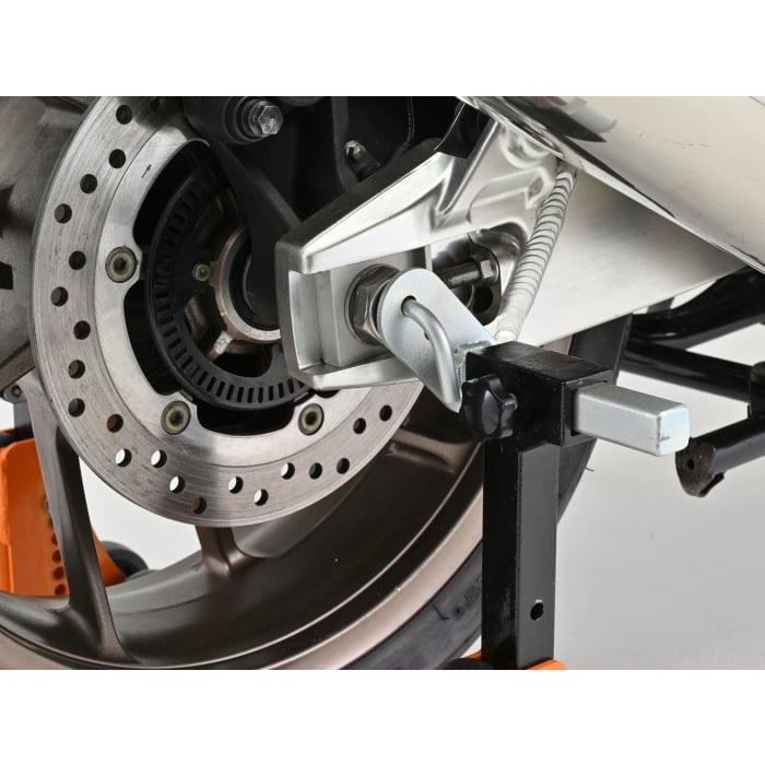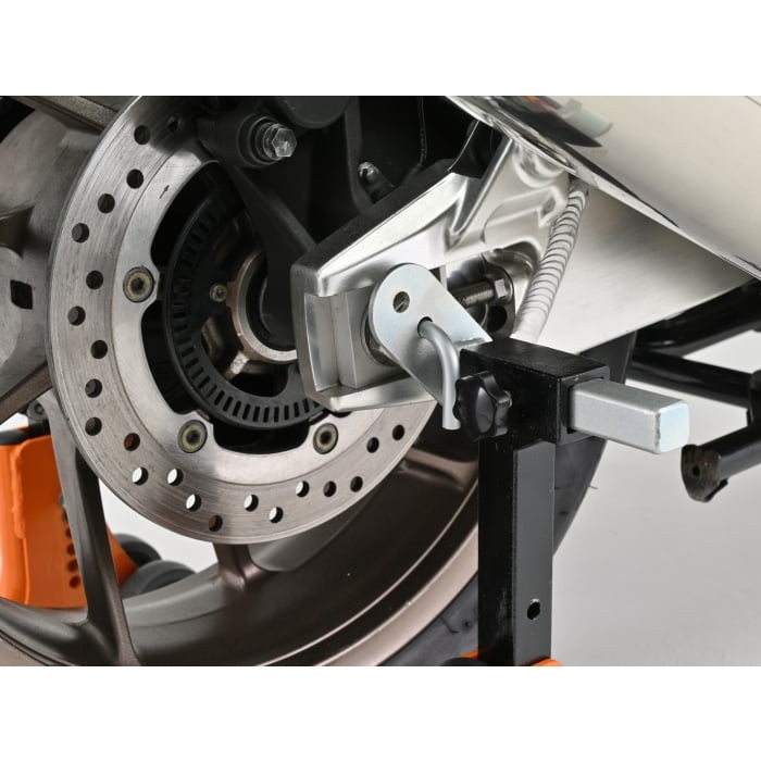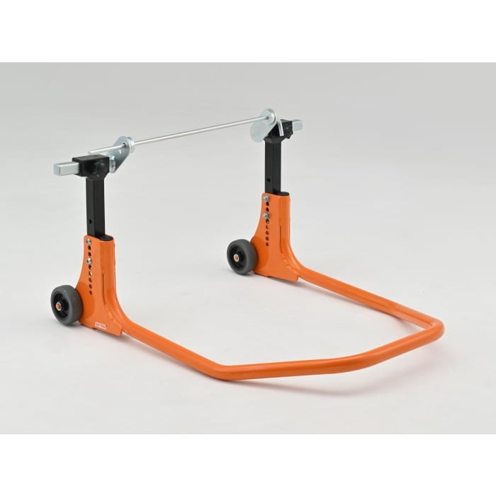 シャフトが中空の貫通アクスルシャフト用スタンド。リアホイールの脱着を伴わない作業(洗車やチェーンメンテナンス等)であれば、スイングアームからスタンドが外れないので、V字やL字受けより安心してリフトアップできるので初心者におすすめです。シャフト受け穴は上下2か所で、前後、上下約14mmのアジャストが可能。スイングアームよりアクスルナットが奥まった車両は、付属のカラーでクリアランス(片側2枚重ね、最大約17mm)を保つことで、スタンドがスイングアームに当たることを防げます。
