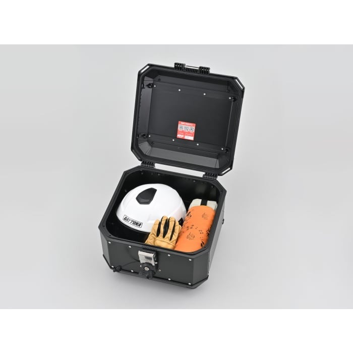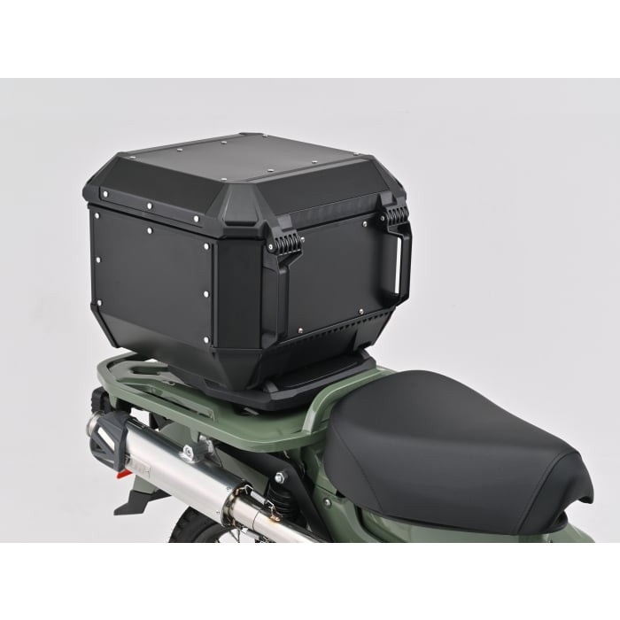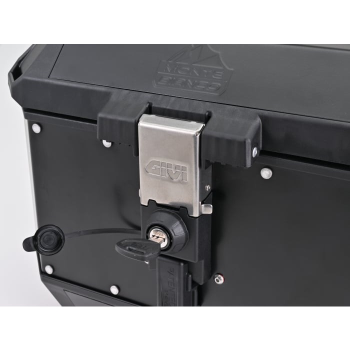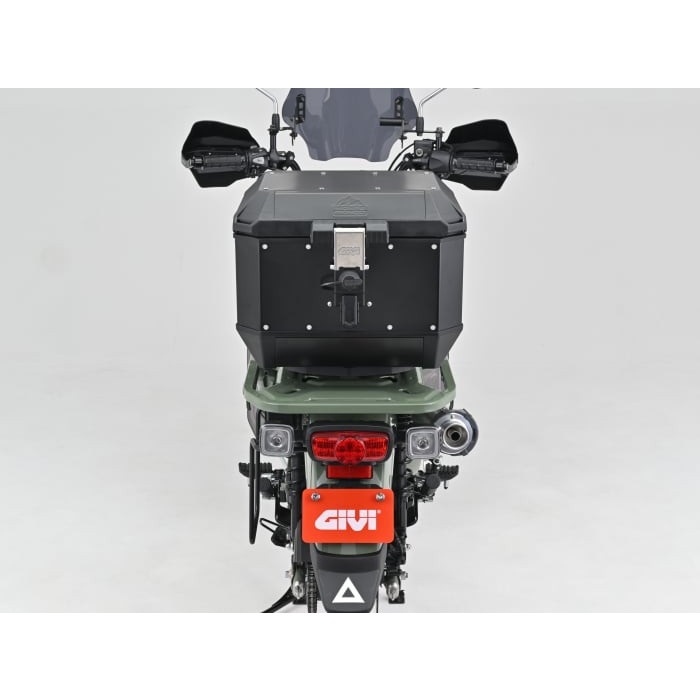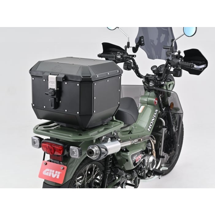 GIVI独自のWIRELEASEシステムを採用し、ケース外部のノブを回すことで簡単にケースの脱着が可能。フラットなケース上面と4か所のベルトループでシートバッグなどを装着可能。後部にハンドルが付き、バイクから取り外し後も持ち運びやすい。