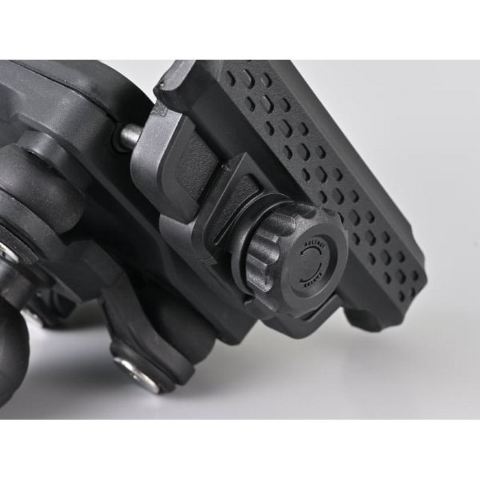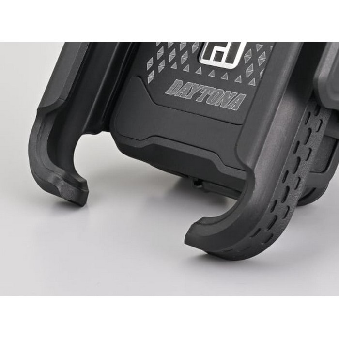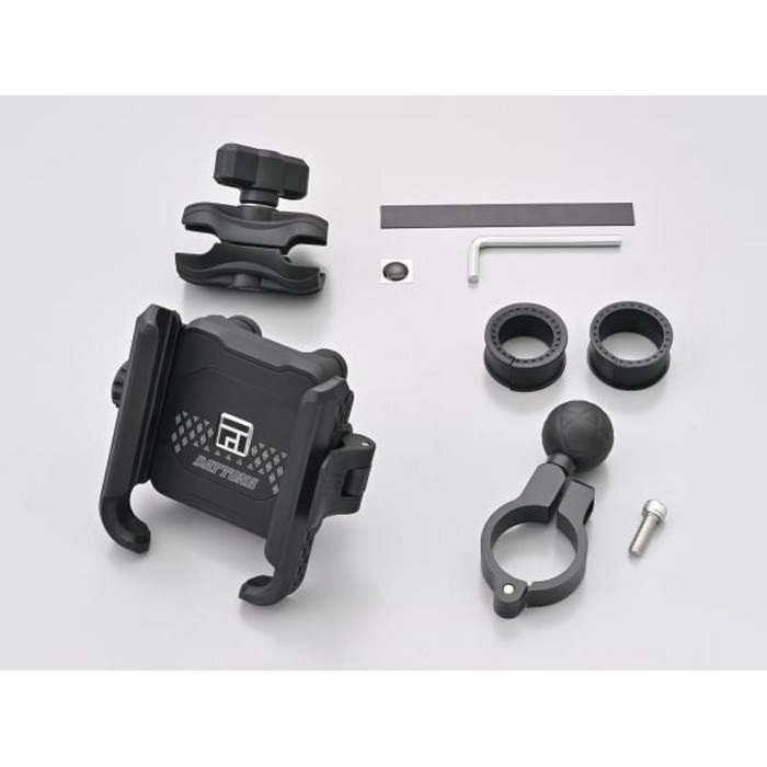 ボールジョイント機構により、自由度の高い位置調整が可能なスマートフォンホルダー。スマホを置いて本体右側のロックレバーを開閉するだけで簡単ロック&リリース。左右の長い高強度アームでスマホを確実に固定します。振動吸収機構が、バイクの振動からスマホを守ります。別売のオプション品と組み合わせることで様々な箇所へ取り付け可能。