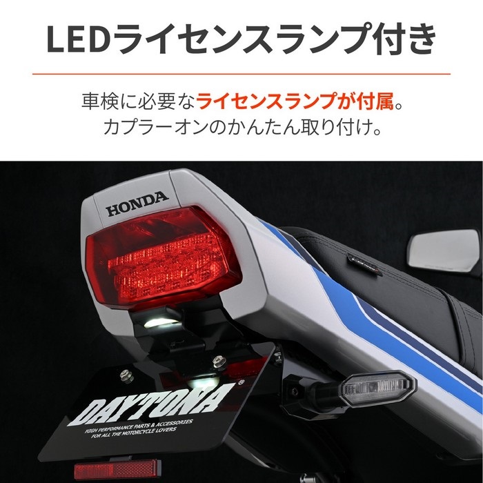 車検対応LEDライセンスランプをセットした、すっきり&コンパクトなフェンダーレスキット。別途ご購入いただく別売品がない、安心の保安基準適合ボルトオンキットです。