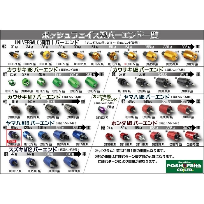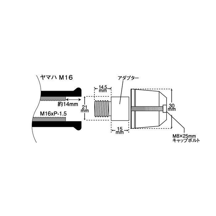 ヤマハ車純正16mmP-1.5ボルト径に適合します。マットカラーは表面に特殊処理を施した後、アルマイト処理をした半ツヤ(マット)仕様です。※取り付けの際、脱落防止の為、ネジロック剤の塗布を推奨致します。【仕様】ヤマハ車純正16mmP-1.5ボルト径に適合【重量】1個あたり約65g左右セット