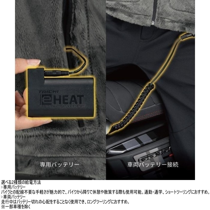 e-HEATご使用時、専用モバイルバッテリー接続の方はe-HEAT 7.2V充電器&バッテリーセット(RSP064)、車両バッテリー接続の方はe-HEAT 車両バッテリー接続ケーブルセット(RSP71 / 067)がそれぞれ必要となります。