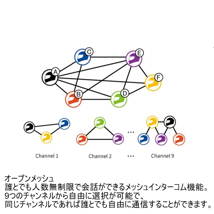 Meshインターコム:人数制限なし、途中で通信が切れても有効距離内で自動復帰可能。