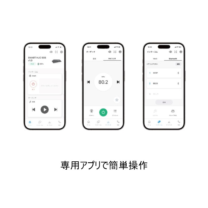 専用のスマートフォンアプリ『SMART HJC BT』で、ペアリングやグループ設定はもちろん、出先で簡単に見られる各種取扱説明書の表示が可能。
