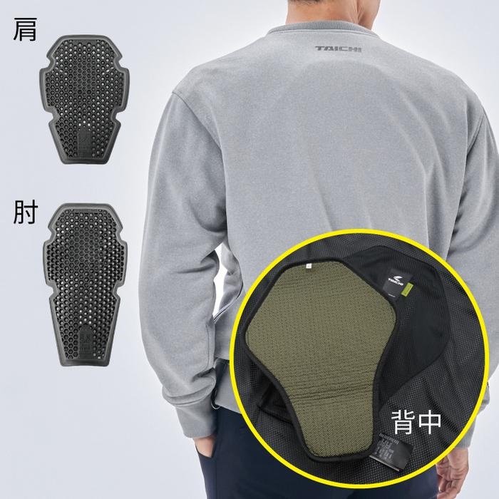 標準装備の肩・肘・背中の各プロテクターはCEレベル2プロテクター(別売り)でアップグレード可能。
