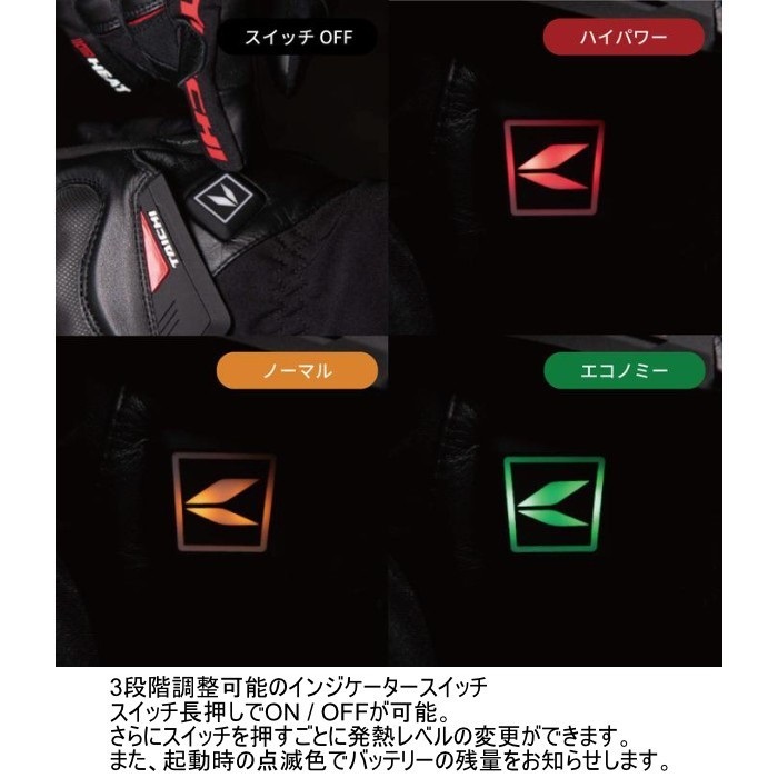 ソフトタイプのプロテクション、防水透湿素材を備えたe-HEATグローブのスタンダードモデル。