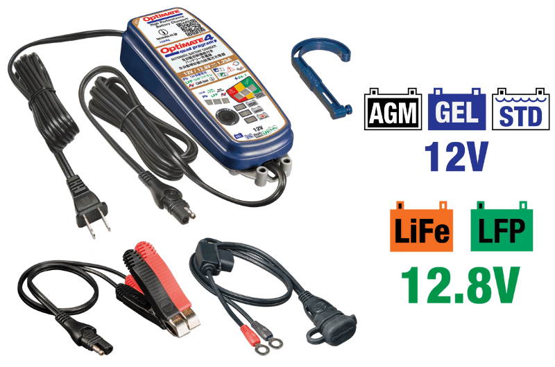 OptiMate 4 Quad Program(オプティメイト 4 クアッドプログラム)は、12V鉛バッテリーはもちろん、12.8Vリン酸鉄リチウム(LFP)にも対応したハイエンド充電器。アドベンチャー、ツアラー、クルーザー、レース車はもちろん、軽自動車や水上バイク、スノーモービルまで幅広くカバーできる、まさに“パワースポーツ向け最上位モデル”です。世界的に評価されており、バイクの長期メンテナンスを重視するライダーに最適の一台です。