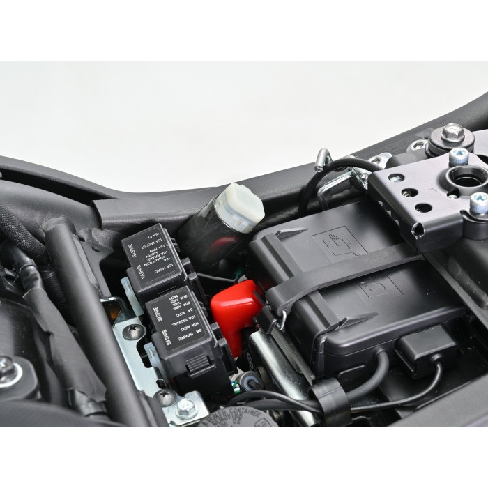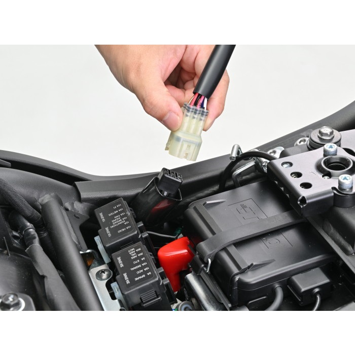 スマートフォンやナビなどの給電に便利な電源取り出しハーネス。カプラー接線でアクセサリー電源の+と-の配線を取り出せるので、イグニッションキーのON⇔OFFに連動し、キーOFFで電源がカットされます。バッテリーに近い「シート下」取り出しタイプを使えば、D-UNITのアクセサリー電源接続も簡単。取り付けが簡単な場所を選び、分かりやすい取扱説明書も付いているので、初心者も安心して取り付けできます。