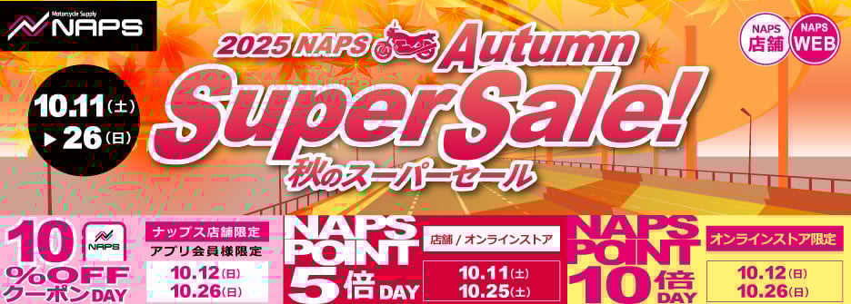 SALE セール商品一覧 OUTLET アウトレット商品一覧 SEARCH商品を探す カテゴリから探す ヘルメット ウェア 用品 メンテナンス パーツ タイヤ ブランドから探す 100% 72JAM AAR ABUS ACE CAFE LONDON ACTIVE ADIO AGV Airhead KNOX DIRTFREAK DRC DREAM PRODUCT EFFEX EKチェーン elf ENDURANCE ETHOS-Design KURE LEAD LINKS MALOSSI Marushin MAXIMA MIRAX MITSUBASANKOWA MOONEYES MORIWAKI MOTUL MOUNT SYSTEM MR. LOCKMAN NANKAI NAPS RK Rookie ROSSO Style Lab ROUGH&ROAD ROUTE66 SCOYCO seal's SENA SHARK SIMPSON SKY SOFT99 SP CONNECT TecMate Vesrah Vipro's w*lt X.A.M YAMAHA ZETA モトボワットBB レイト商会 花山 山城謹製 匠 青島文化教材社 FIVE Flagship Flat-LAB. Forma FOX RACING FREE BEE HOUSTON HURRICANE HYOD HYPERPRO gully HARD WORX HARLEY-DAVIDSON HEAT GROUP JRP J-Trip JUQUE K・CON Kabuto QSTARZ QUAD LOCK RAM MOUNTS STRIKER SUGAR RIDEZ SUNSTAR SUOMY GIVI GLARE OVER RACING PROJECTS Oxford PIRELLI PMC POD POI DESIGNS Point 65 Polisport POSH Faith T-REV Tricepuot TRICK ATAR T'S TSR TwinAir ZOLTAR Valenti 153GARAGE AlterLock AMBOOT Motone Customs OLE FIRST EnergyPrice オールマイティ AMERICAN DREAM REBORN B-TAS FIREBALL AKRAPOVIC ALPHA INDUSTRIES alpinestars amon Arai ARCHI ariete A-TECH AWD AXP AZ B+COM BIKE BARN BITO R&D BUCO C.F.POSH Cardo CR-1 DEGNER DELTA DELTA DIRECT DFG DUNLOP EXTRA SHIELD EZ-SHIFTER FACTORYEFFEX FASTHOUSE FREEZE TECH FSPプロテクション FURUKAWA BATTERY G.P.COMPANY GAERNE GALE SPEED GOLDWIN GREEDY HenlyBegins hirayama-sg HJC HONDA ideal Indian iRC JAM'S GOLD KADOYA Kaedear KAPPA Kawasaki KEDO KN企画 KOMINE KOOD K-Pit K-PLUS KRIEGA LIQUIMOLY LOTUS PERFORMANCE LS2 HELMETS M.MOWBRAY MCP MET'Z METZELER MICHELIN MIDLAND MIGRATRAIL motion Moto Planning Motor Samurai Moto-Viper MOTOWN Naps Sports NAPS Value Engineering NEW ERA N-PROJECT NSK ODI OHLINS OZ Racing Party-up Permatex PIAA Pine Valley POWERAGE ProTOOLs RENTHAL RIDEZ Rids Fly r's gear TAICHI S:GEAR SHIFT SHOEI SIERRA DESIGNS Simon SPEED OF SOUND SPEEDRA SPHERELIGHT SPIDI SPOON SPOON JET SP忠男 SUPER ZOIL SUPER73 SurLuster SUZUKI SW-MOTECH THOR THRASHER ThreeD TNK工業 TORUNA unicar UNIT urbanism vanson VENTURA WILDWING Willis&Geiger WINS JAPAN YELLOW CORN YOSHIMURA Y'S GEAR Yupiteru ZEALOT ZERO GRAVITY ZERO POINT SHAFT スペシャルパーツ武川 TANAX 谷尾商会 SPICERR GIBEON BEELINE FURYGAN BATES BEAMS BEET BELL BRAKING brembo BRIDGESTONE BS BATTERY Castrol CGC CLAY SMITH CLEVER Clever Decor Clever Homme Clever Vivace Clever Wolf D.I.D Dachi DAINESE DAYTONA NGK NITRON NOBLEST NOLAN KEIHIN KIJIMA KITACO ブランド一覧を見る MOVIE動画 【KADOYA創業90周年】バイク乗りが選ぶ人気ジャケット&スタッフ激推し3選!! ️ 今年で創業90周年を迎える革ジャンの老舗カドヤの直営店、浅草にある『KADOYA 東京本店』にて、人気ジャケットとスタッフおすすめジャケットをそれぞれ3つ紹介していただきました! 初めての購入や買い替え等をご検討されている方はぜひ参考にしてみてください! NEWSお知らせ 【重要:当社を装った偽サイト/広告にご注意ください。】 現在、当社に似せた偽サイトやSNS広告が確認されています。公式サイト以外での購入はクレジットカード被害や個人情報流出のリスクがあります。ご利用の際は、リンク先のウェブサイトのURLが「当社の公式ドメイン」であるか、ご確認をお願いいたします。 - https://www.naps-jp.com/ (ナップスオンラインストア) - https://shops.naps-jp.com/ (ナップス店舗情報ウェブサイト) ▽株式会社サイン・ハウス「ポケッタブル高圧洗浄機SWU-1・PHP-1」の自主回収のお知らせ▽※現在販売中の『SWU-201』は前モデル『SWU-1』からバッテリーセル製造サプライヤーを変更し、安全を確認した製品として販売しております。株式会社サイン・ハウスから「ポケッタブル高圧洗浄機SWU-1・PHP-1」製造の問題により、該当商品の回収&交換の実施を行うこととなりました。詳細は株式会社サインハウスのサイトをご覧ください。 お知らせ一覧はこちら FEATURE特集記事 【徹底検証】アルパインスターズ スーパーテックR10|実走行で分かった静粛性・空力・快適性をレビュー! ライダーの疲労を軽減!バイクで快適に走るための厳選アイテム8選【振動・腰痛対策】 革ジャンがバイク乗りにおすすめな理由とは?老舗メーカーのKADOYAに聞いてみた! 知らなきゃ損!バイクの寿命を守るツーリング後に必ずやるべきメンテナンス6選 ブレンボブレーキは本当に必要?バイク乗りが語るメリット・デメリットと選び方 急な雨にも慌てない!バイク用防水バッグおすすめ10選|リュック・サイドバッグ・レザーまで網羅 特集記事一覧を見る FOR ALL RIDERS FOR ALL RIDERS FOR ALL RIDERS FOR ALL RIDERS FOR ALL RIDERS FOR ALL RIDERS FOR ALL RIDERS FOR ALL RIDERS FOR ALL RIDERS FOR ALL RIDERS FOR ALL RIDERS FOR ALL RIDERS HELMET RANKINGヘルメットランキング No.1 RX-7X HAGA (ハガ) フルフェイスヘルメット メーカー希望小売価格 ¥84,700(税込) オンラインストア販売価格 ¥84,700(税込) No.2 RX-7X フルフェイスヘルメット グラスホワイト メーカー希望小売価格 ¥74,800(税込) オンラインストア販売価格 ¥74,800(税込) No.3 RX-7X TSUBASA (ツバサ) フルフェイスヘルメット メーカー希望小売価格 ¥84,700(税込) オンラインストア販売価格 ¥84,700(税込) No.4 K1 S JIST Asian Fit フルフェイスヘルメット MATT BLACK メーカー希望小売価格 ¥34,100(税込) オンラインストア販売価格 ¥34,100(税込) No.5 RX-7X NAKASUGA 4 (ナカスガ4) フルフ