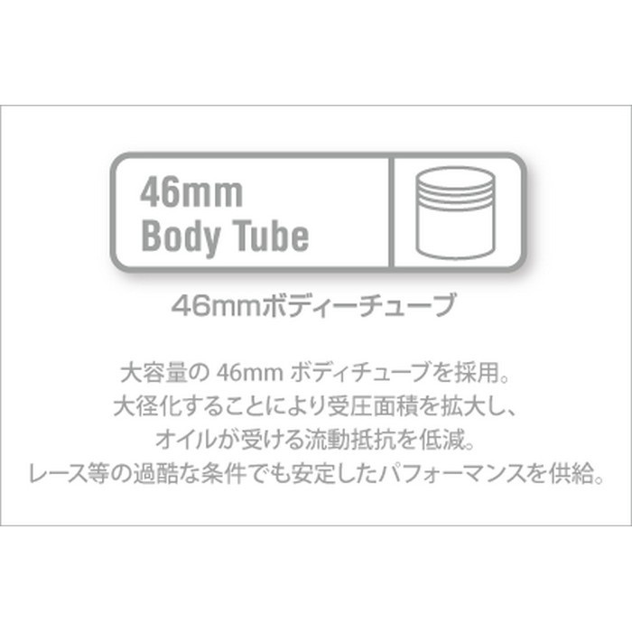 RACEPROシリーズは、R3シリーズに採用される 完全独立3系統ダンピングアジャスターはそのままに、 よりシビアなダンピングセットが要求される スーパースポーツに贈るナイトロンのフラッグシップショックアブソーバー。 ボディー径を従来の40mmから46mmへ 大径化することで受圧面積を拡大し、 オイルが受ける流動抵抗を低減することに成功。 それにより極低速域でのダンピングレスポンスの向上と 高速域での 減衰力を確保することも可能とする。 また、オイルの能力低下を抑え厳しいコンディション下でも 理想のダンピング特性を維持し続けることを可能とした。 マン島TTレースに代表される、英国の厳しいレースシーンから フィードバックされたRACE PROシリーズ。 まさにスーパースポーツ専用といっても過言ではない 高いポテンシャルを秘めている。