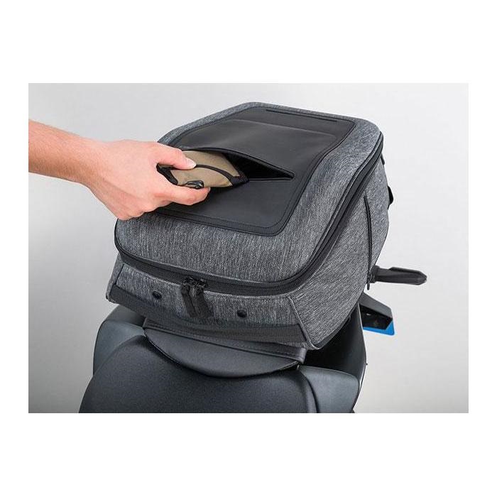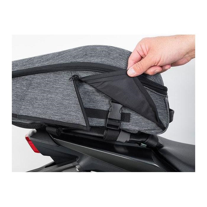 ファスナー全開時の荷物落下を防ぐマチ付き。シートバッグとして使用する時に荷物の出し入れがしやすいように、分離式を採用しました。