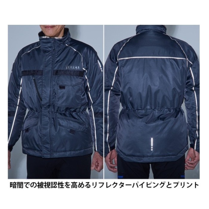 正面からの風の侵入を防ぎます。ダブルジップ仕様で細かい開閉調節可能。引き手にYAMAHAロゴ入り。