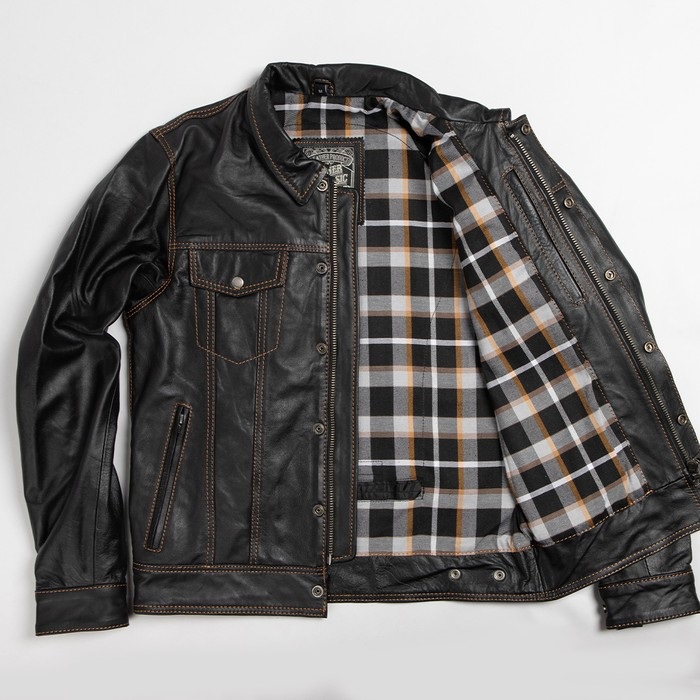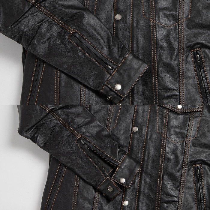 ステッチがアクセントの牛革を使用した、オールシーズンジャケット。