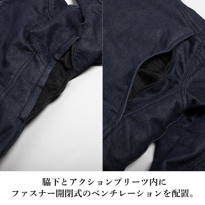 脇下とアクションプリーツにベンチレーションを配置し、ムレを軽減。