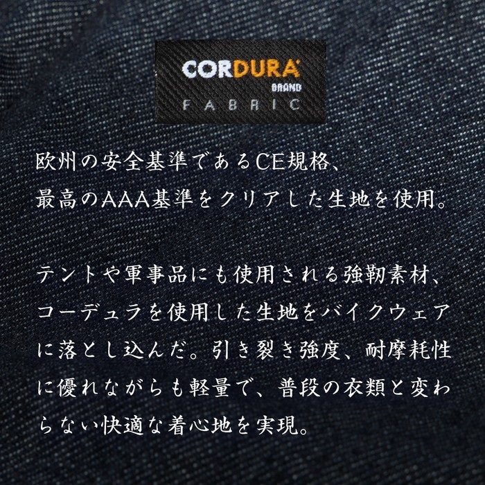 CE規格AAAクラスのコーデュラデニムを使用。テントや軍事品にも使用される実績のある素材。
