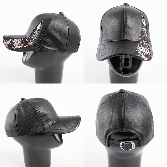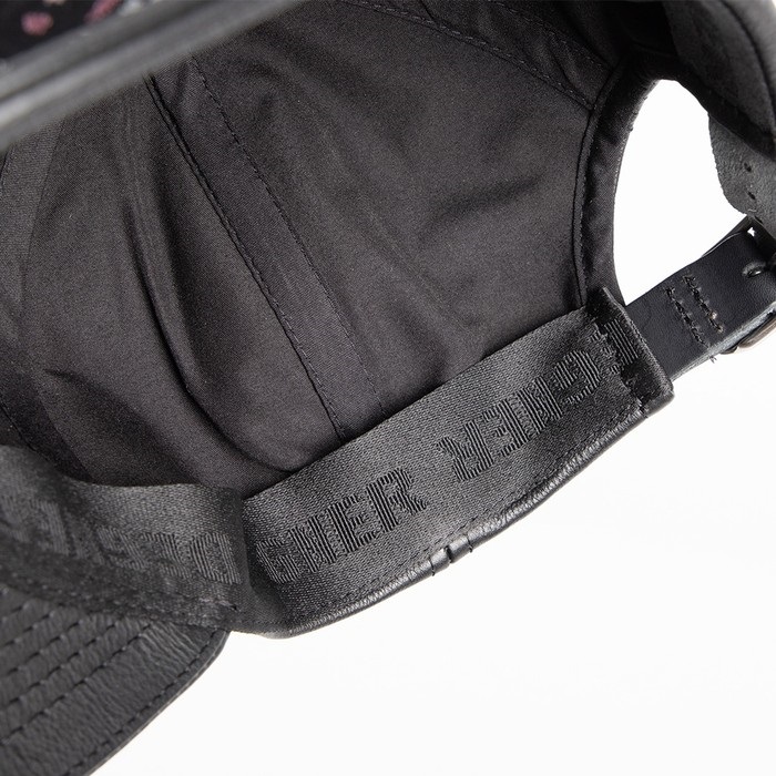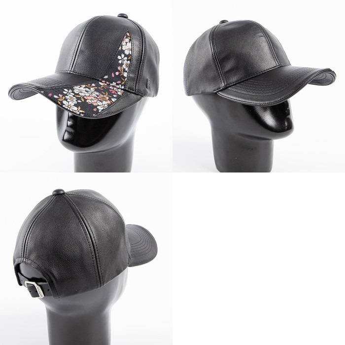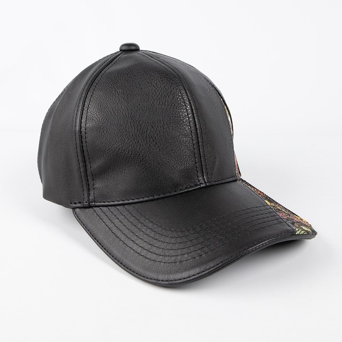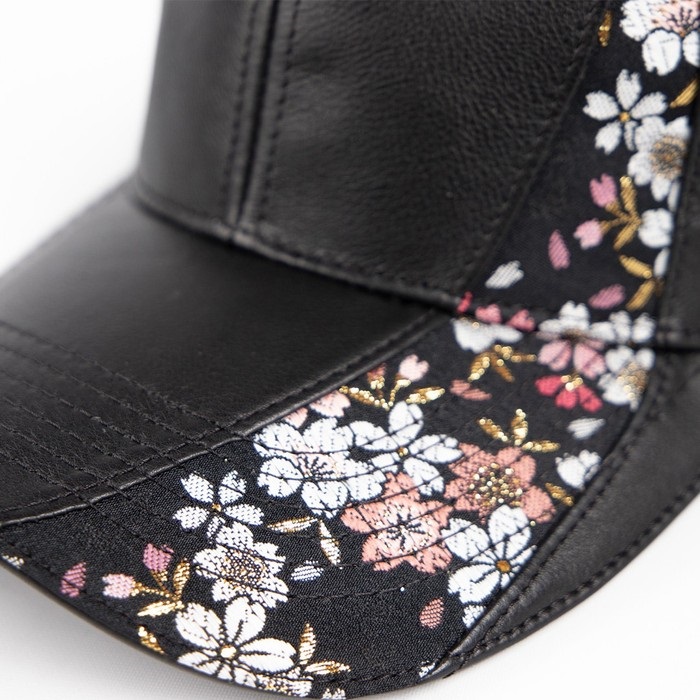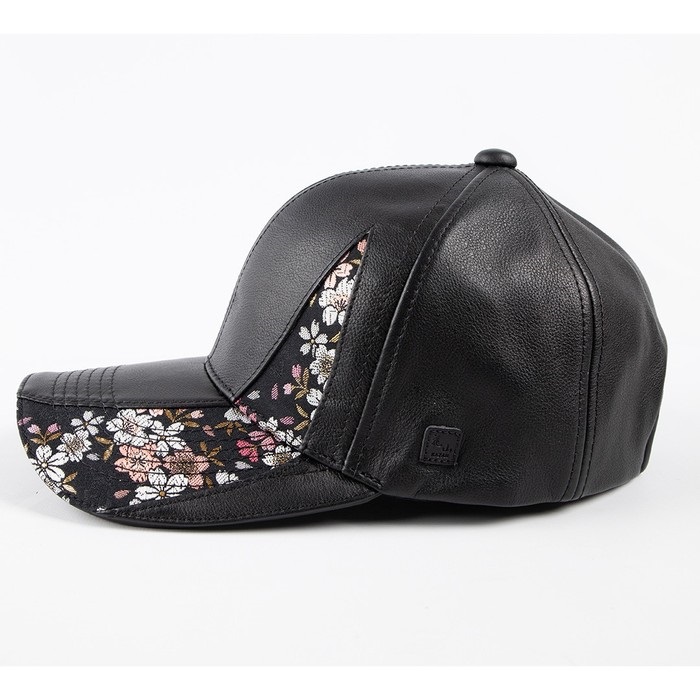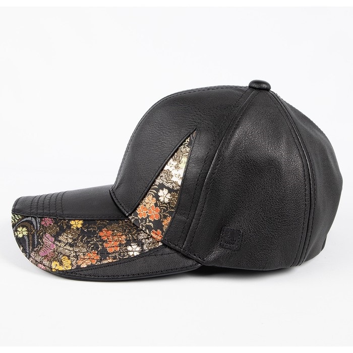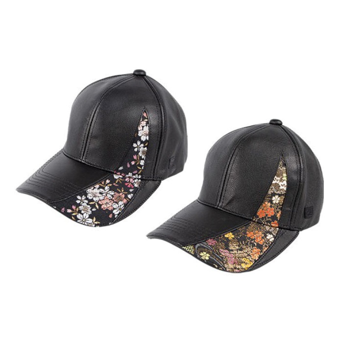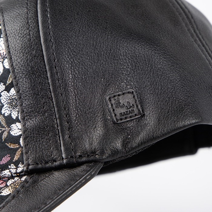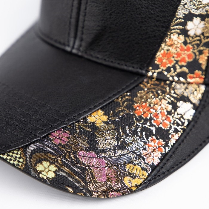 本革を使用したレザーキャップに、煌めく華やかな金襴織物をあしらった。