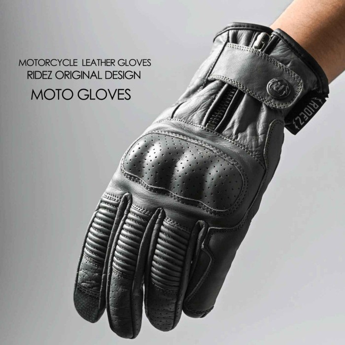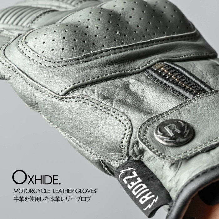 ヨーロッパ・ブリテシッシュデザインをコンセプトに制作しました。シリーズの中でひときわ目立つシャーリングです。レザーをジャバラ状縮め加工する事で、グローブが綺麗な曲線カーブを描き、自然とグリップが握りやすい形になっています。コンチョボタンには、RIDEZの新しいロゴを刻印、細部にはRIDEZのタグを配置しました。サイズ調整には、ベルクロは(マジックテープ)あえて使わず、ボタンとファスナーを採用しました。耐久性も高く長年愛用して頂けるように細部まで拘った手袋です。