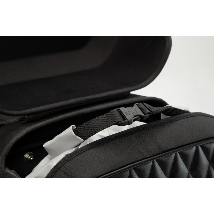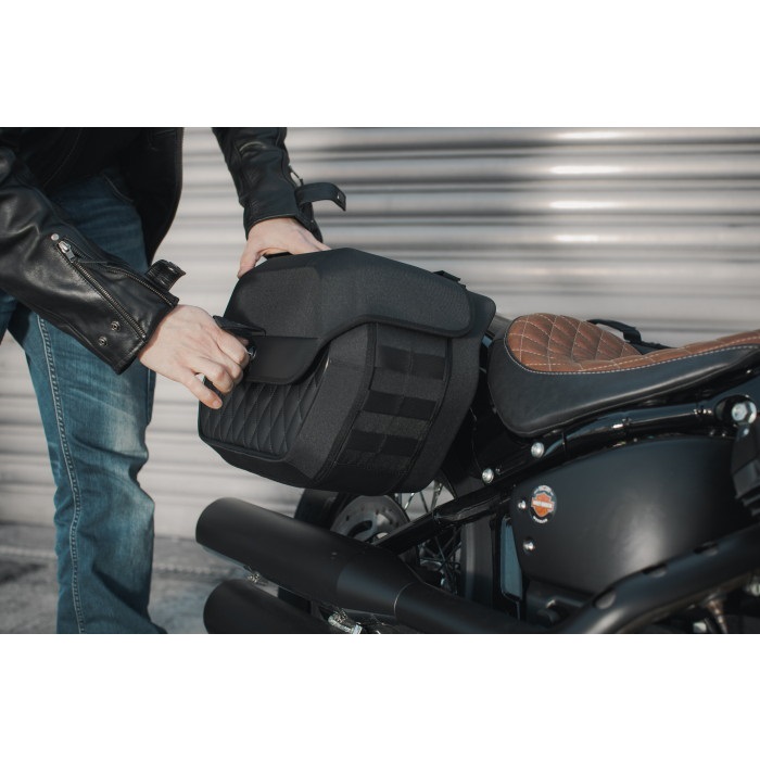 ソフトバッグの雰囲気を持ったクルーザー専用ハードタイプのサイドバッグ。紫外線に強い600デニールのポリエステルと、ダイヤモンドステッチを入れた合成皮革の組み合わせでラグジュアリーで魅力的な外観と耐久性をあわせ持ちます。