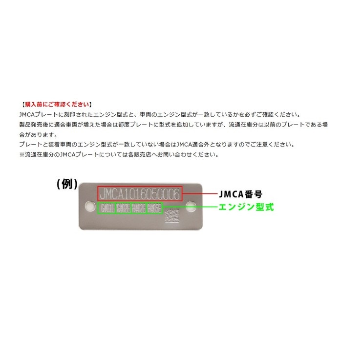 プレートと装着車両のエンジン型式が一致していない場合はJMCA適合外となりますのでご注意ください。