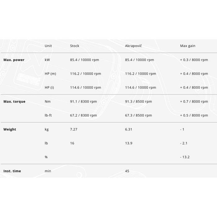 リマッピング不要のプラグ&プレイ仕様で、スロットルレスポンスと性能を最適化。8,000rpmで0.3kW(0.4hp)の出力向上、0.7Nmのトルクアップを実現し、純正比13.2%(1.0kg)の軽量化を達成しています。