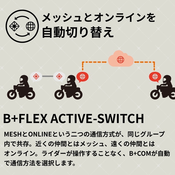 B+FLEX ONLINE(β版):Bluetooth 接続したスマートフォンの電波を使用するオンライン通話機能です。 インカム通信圏内から離れてしまった場合でも、通話を保ったまま