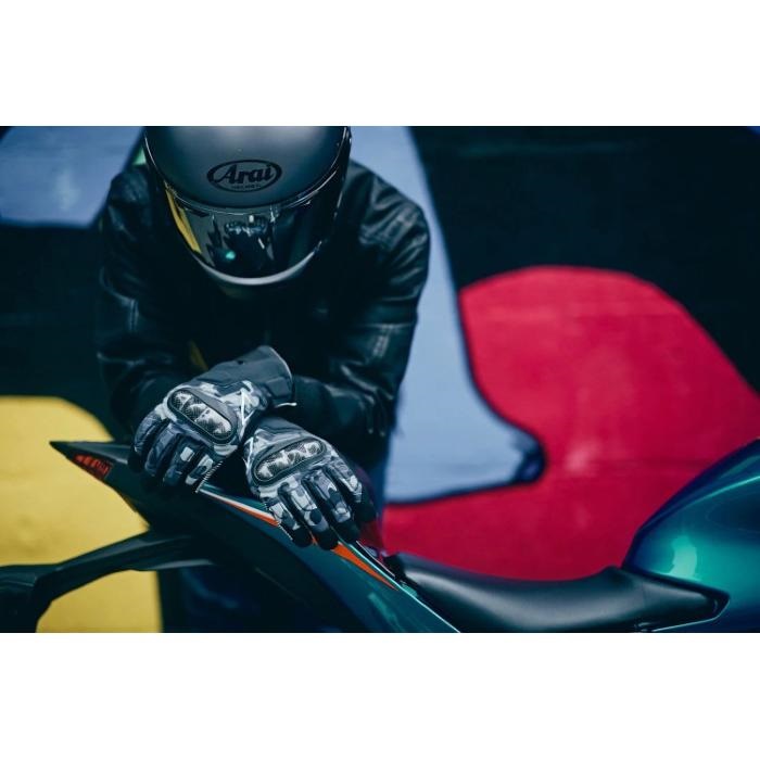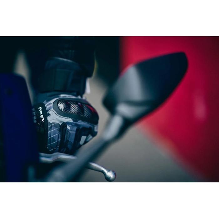 デザインのアクセントであるとともに、安全にも寄与します。甲にはカーボンナックルプロテクターを装備。