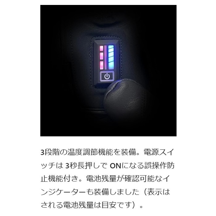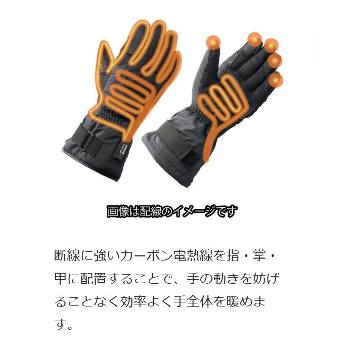 断線に強いカーボン電熱線を指・掌・甲に配置することで、効率的に手全体を温めます。