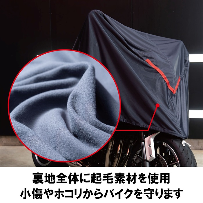 柔らかく伸縮性のある裏起毛素材が、車体をやさしく包み込み、埃や細かな擦れ傷からしっかりガードします。