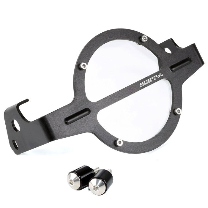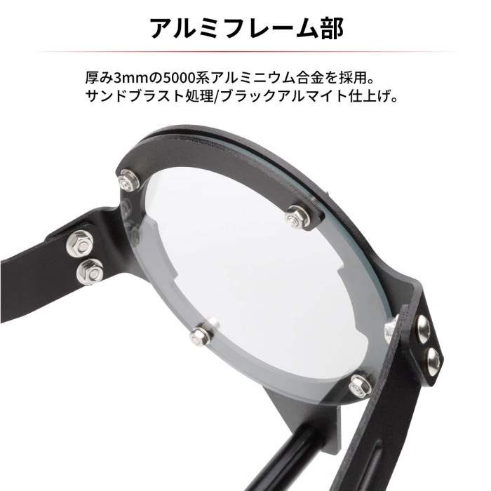 頑丈なアルミ製フレームと、照射を妨げないポリカーボネート製プロテクターによるハイブリッド構造のヘッドライトガード。