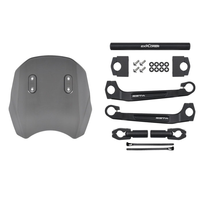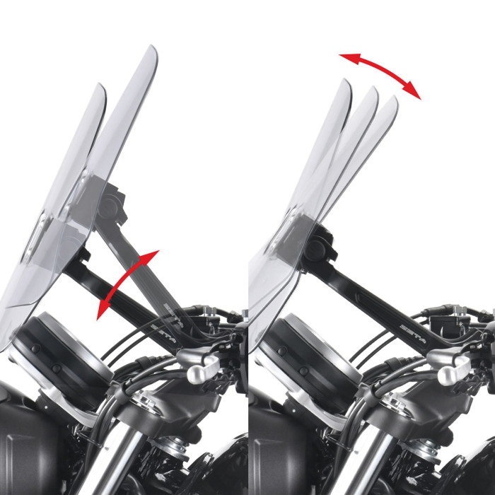 ハンドルバーに専用アダプターを装着し、アームを取付ける。好みに合わせて上下反転可能なスタンダードスクリーンを標準装備したスタンダードスクリーンタイプと、単眼丸目ライトに合わせた設計のショートスクリーンを標準装備したショートスクリーンタイプをラインナップ。