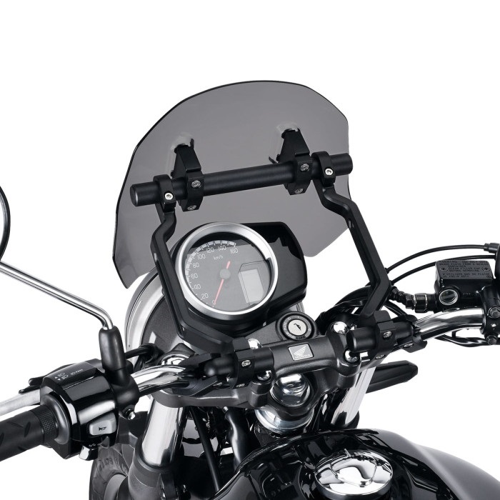 ボルトオン装着が可能なウィンドシールド。モバイル機器の取付けに便利なマウントバーを標準装備。