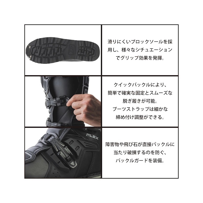 コストパフォーマンスに優れる、スタンダードモトクロスブーツオフロード初心者~中級者に最適な、フラットソール モトクロスブーツ。
