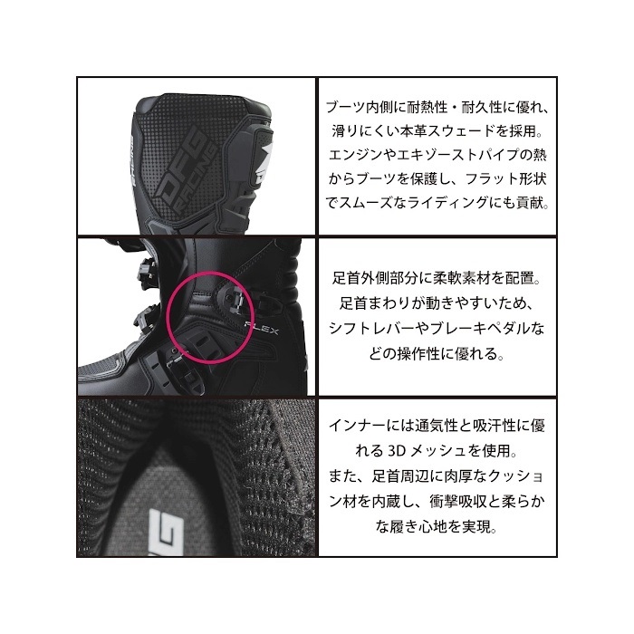 シフトレバーやブレーキペダルなどの操作性に優れる。 - インナーには通気性と吸汗性に優れる3Dメッシュを使用。