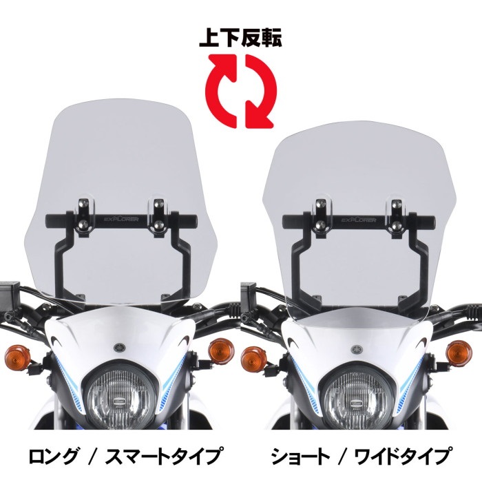 好みに合わせて上下反転可能なスタンダードスクリーンを標準装備したスタンダードスクリーンタイプと、単眼丸目ライトに合わせた設計のショートスクリーンを標準装備したショートスクリーンタイプをラインナップ。