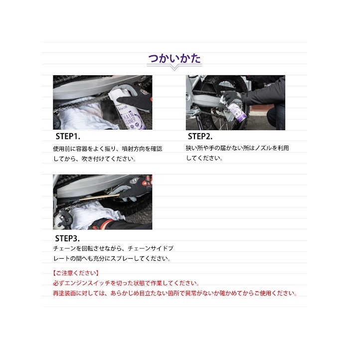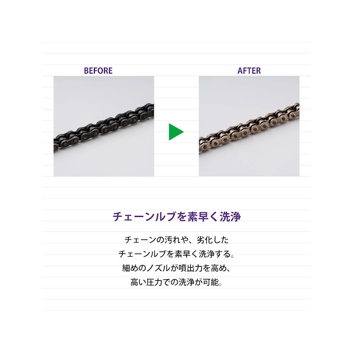 チェーンの汚れや、劣化したチェーンルブを素早く洗浄する。