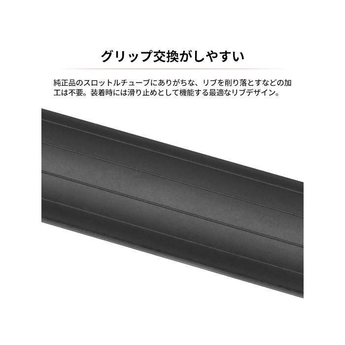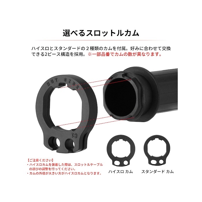 ハイスロとスタンダードの2種類のカムが選べる2ピース構造のスロットルチューブ。