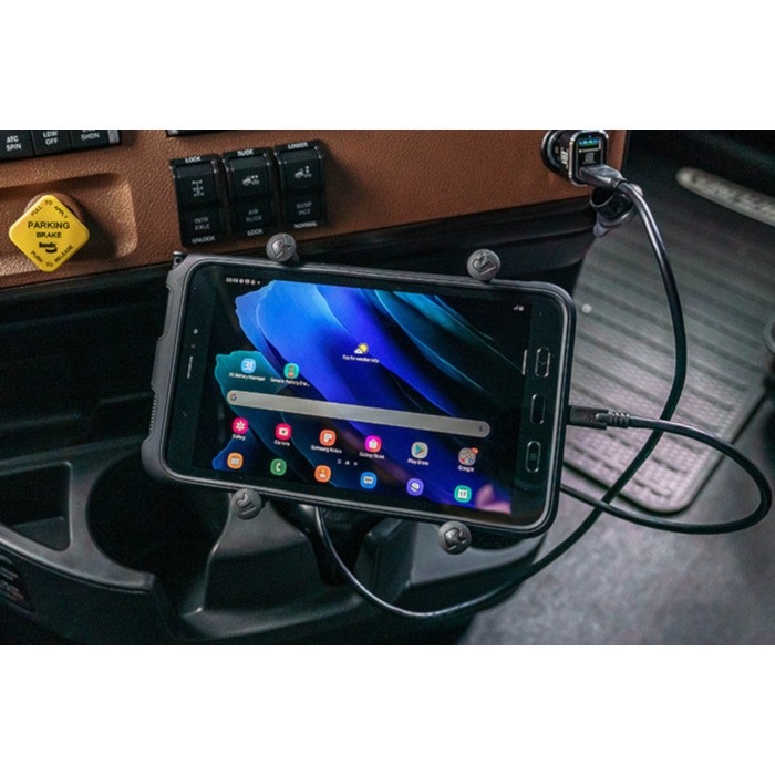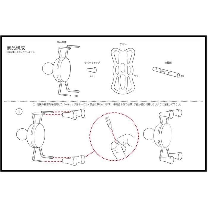Xグリップのマウント部品に、さらにマウント対象物(ipad mini、タブレットPC等)をホールドしておけるテザー(ゴムバンド)が追加になったセットです。