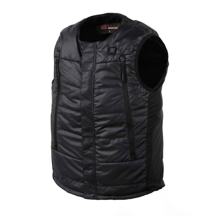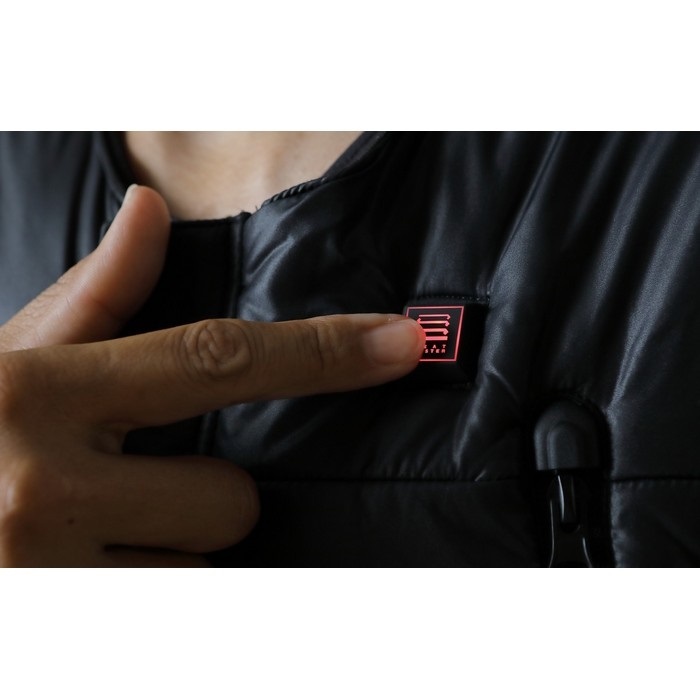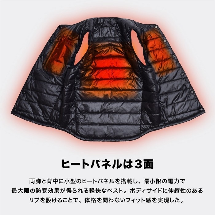 両胸と背中に小型のヒートパネルを搭載し、最小限の電力で最大限の防寒効果が得られる軽快なベスト。